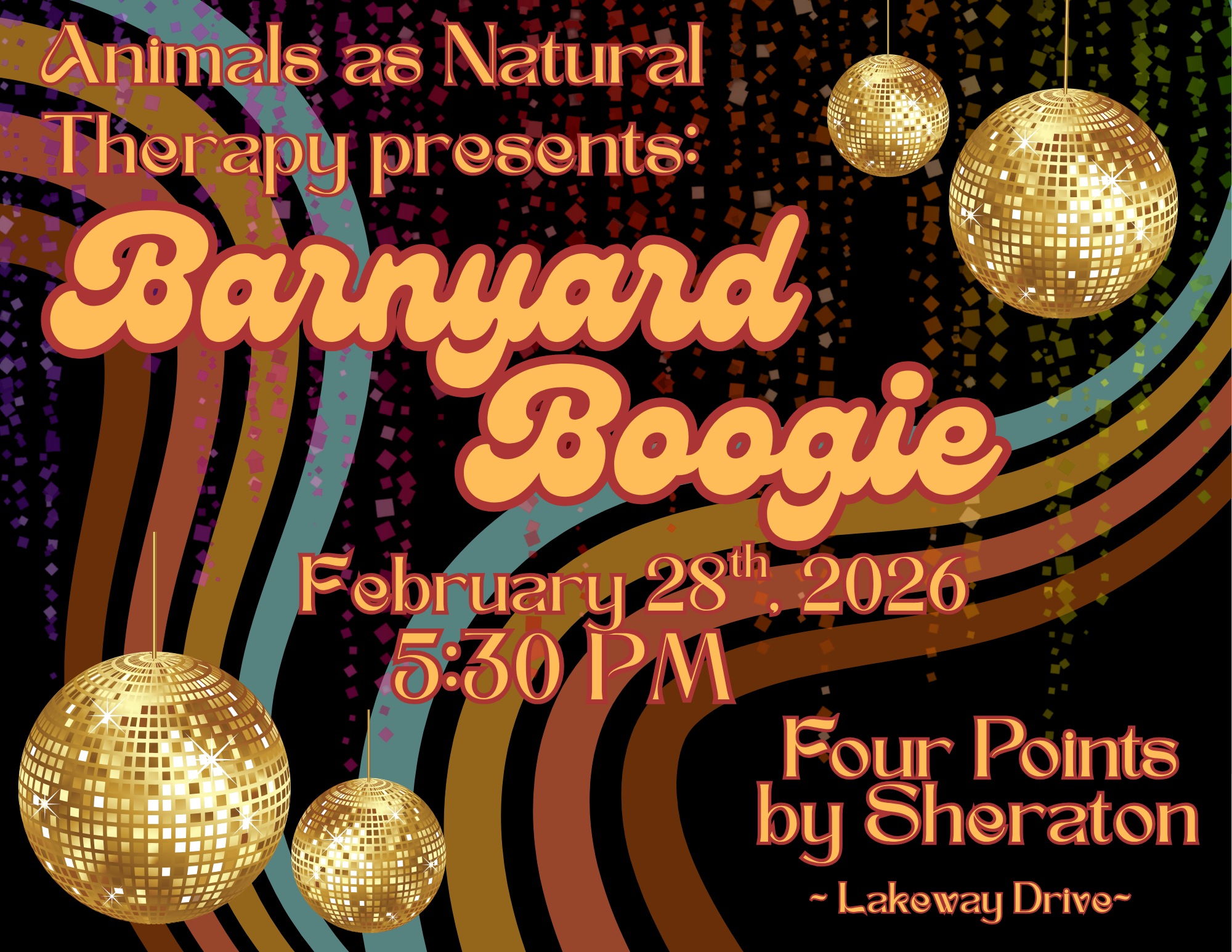 Dust off your sequins and join Animals as Natural Therapy for our signature fundraising celebration, the Barnyard Boogie Gala, on Friday, February 28th at 5:30 PM at the Four Points Sheraton on Lakeway Drive. This year’s theme is DISCO, bringing a night of sparkle, rhythm, and community together in support of life-changing animal-assisted programs.